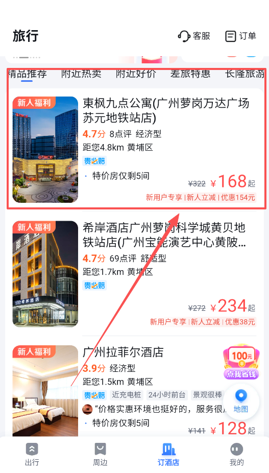 4、订酒店的时候,选好日期和房型,再点价格排序就能找到合适的,用地图选酒店还能看清楚具体位置。