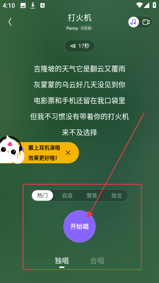 2、进入歌曲演唱准备页面后,点击【开始唱】按钮,就可以开始演唱歌曲,一展歌喉哦。
