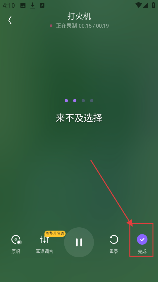 3、演唱过程中,若完成演唱,点击【完成】按钮,就能结束录制,进入歌曲编辑页面啦。