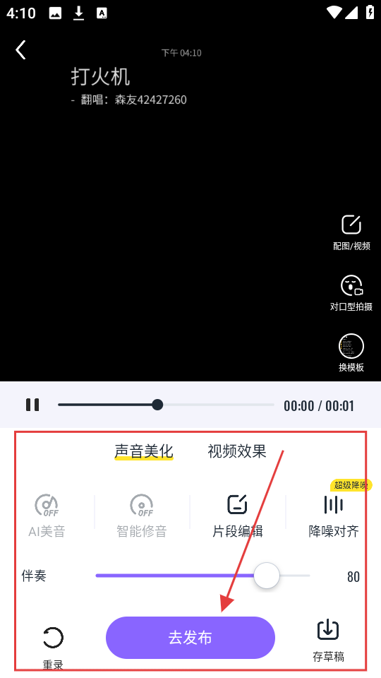4、在歌曲编辑页面,可进行声音美化、视频效果等设置,设置好后点击【去发布】,就能分享自己的演唱作品啦。