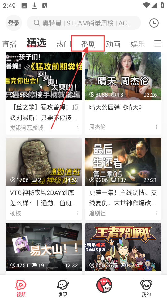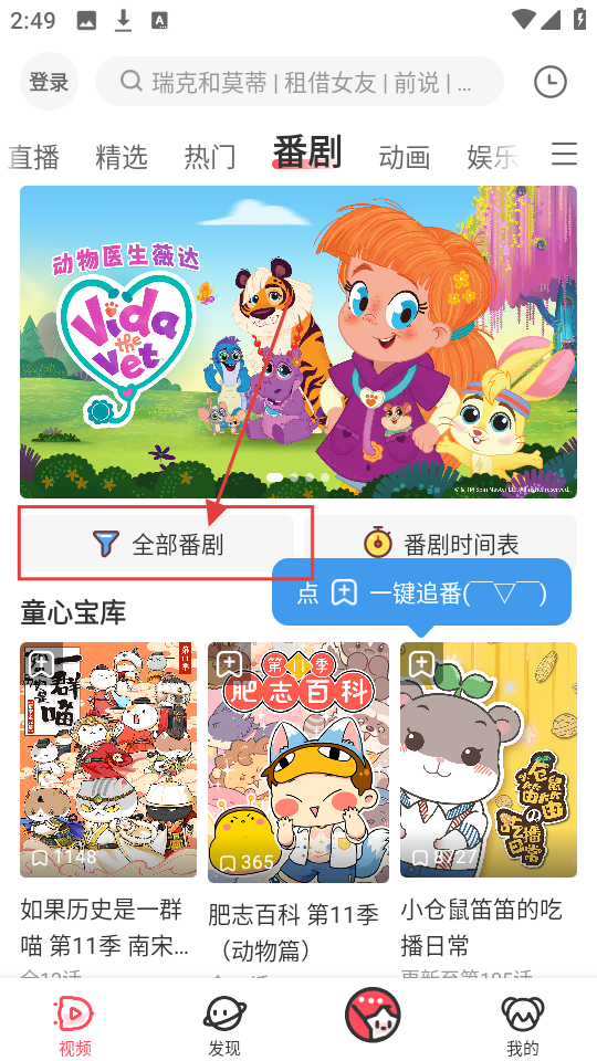 1、我们在软件首页,能看到“直播”“精选”等分类标签,点击【番剧】,就能进入番剧分类页面,查看各类番剧内容啦。