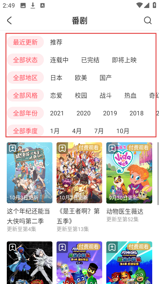 3、进入番剧筛选页面后,有最近更新等分类,还有全部状态等筛选条件,我们可以根据需求选择筛选条件,找到想看的番剧。