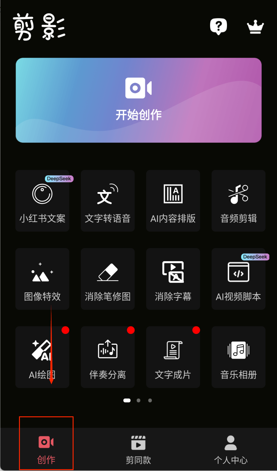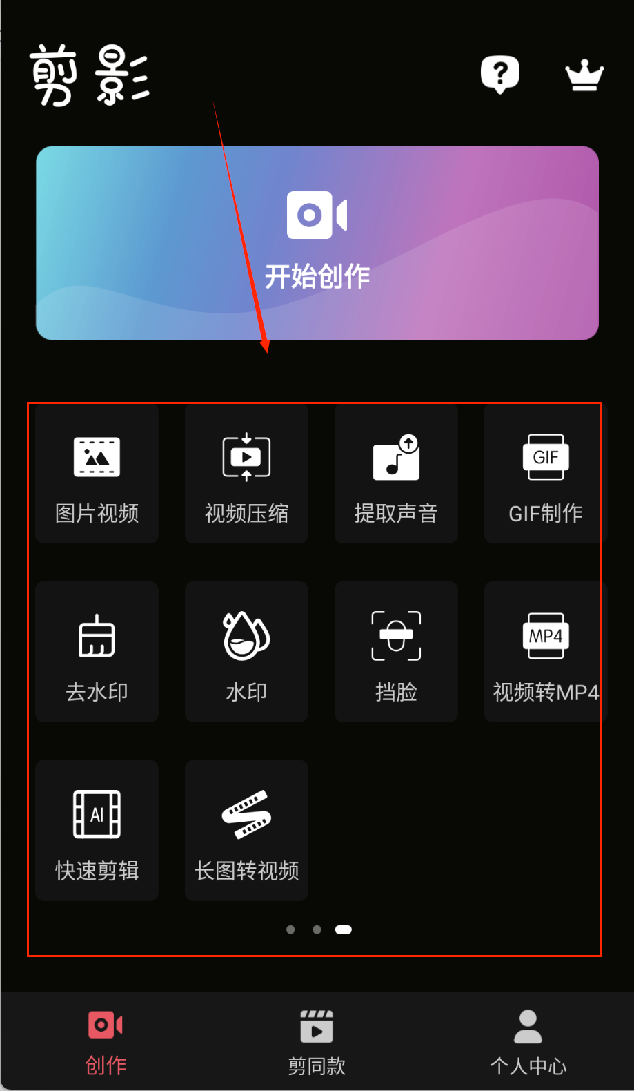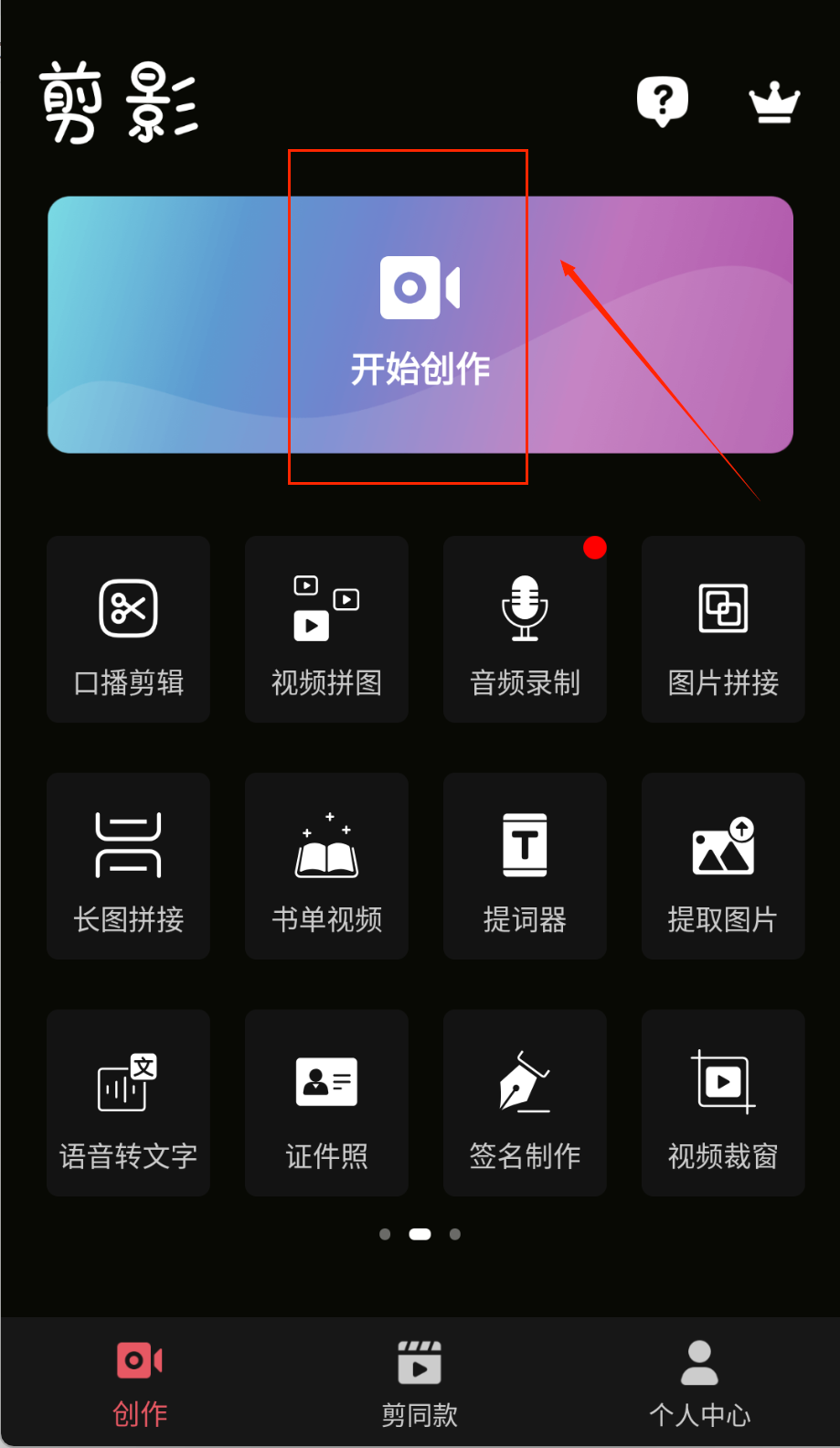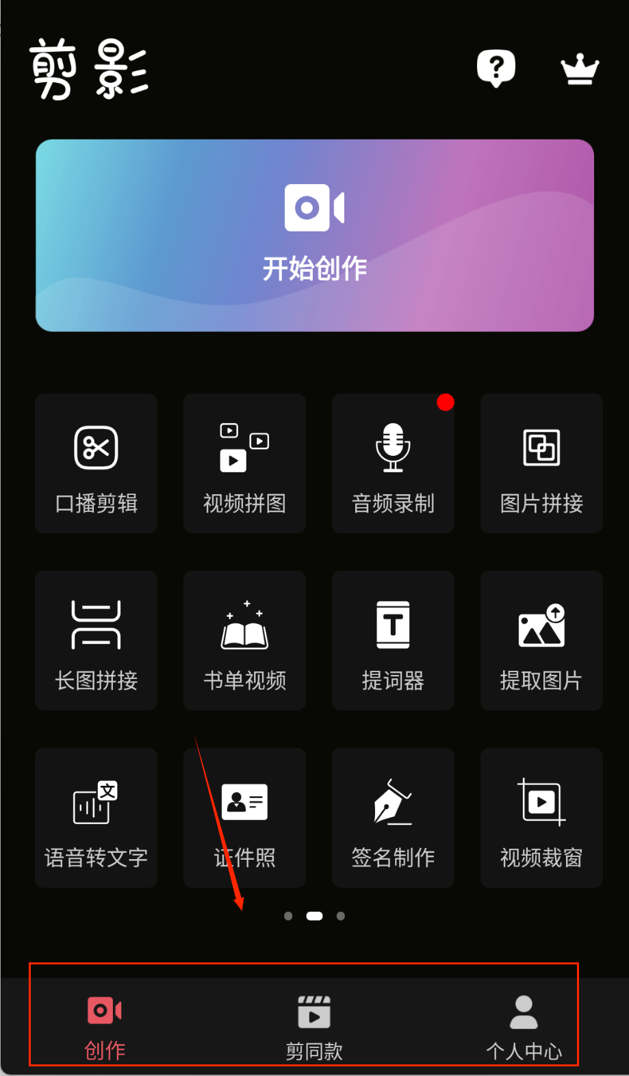 2、在主界面下方有创作、剪同款和个人中心三个导航选项,创作是红色选中状态,这里包含口播剪辑、视频拼图等实用工具。