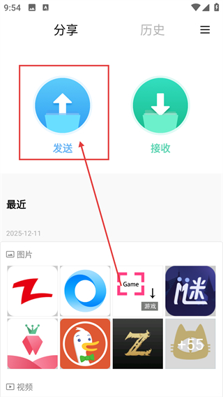 1、在分享页面点击【发送】按钮,就能进入文件选择界面,准备挑选要分享的内容啦。