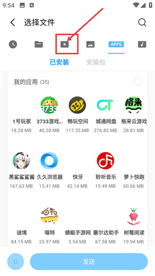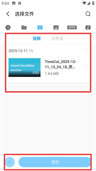 2、进入选择文件页面后,点击顶部的视频图标,就能切换到视频分类页,查看可分享的视频文件哦。