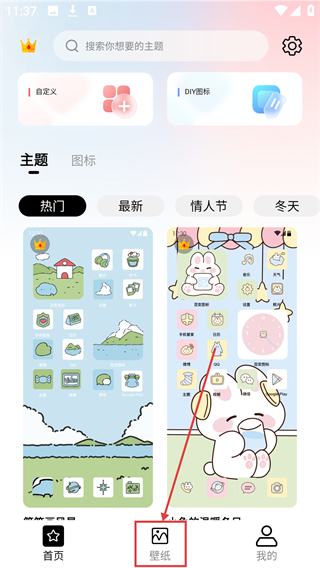 1、在应用首页,点底部【壁纸】选项能进入壁纸专区,挑选不同风格的壁纸来装扮桌面哦。