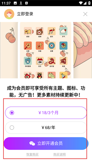 4、触发应用操作后会弹出会员开通提示,可选对应套餐开通,解锁无广告及更多素材的使用权限哦。