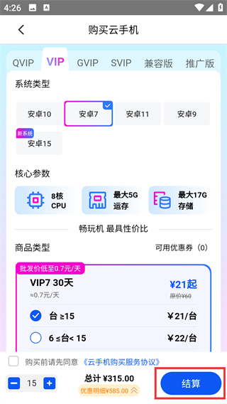 4、在购买云手机页面选好配置和数量后,点击【结算】按钮,就能进入支付流程完成购买啦。