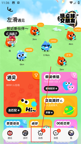 1、在主页面点击底部的【动态】选项,就能进入动态广场页面,查看大家分享的内容啦。