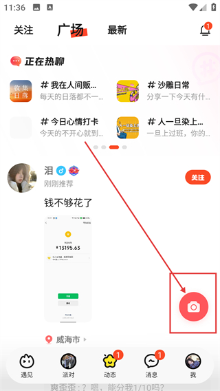 2、进入动态广场后,点击右下角的相机按钮,就能打开动态发布的编辑界面准备创作啦。