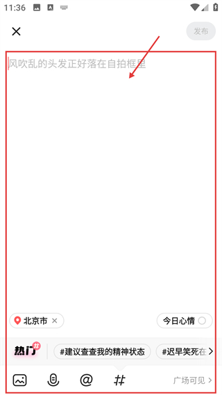 3、在动态编辑页,可输入内容、添加话题,还能设置定位,完成后就能准备发布动态啦。
