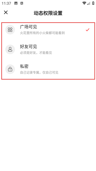 4、在动态权限设置页,可选择【广场可见】【好友可见】等权限,设置动态的可见范围哦。