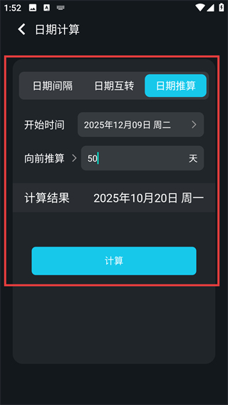 4、在日期推算页设置好开始时间和推算天数(比如50天),点击计算就能得到对应的结果日期啦。