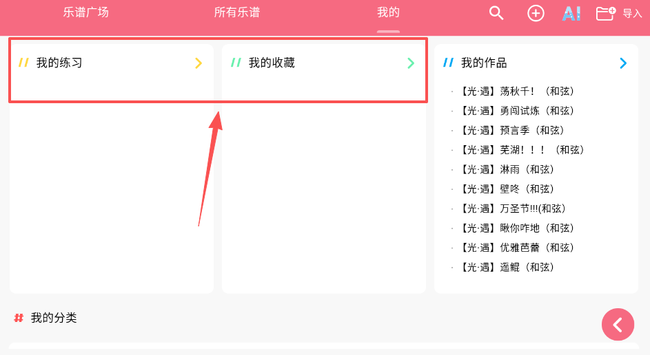 4、请记得在乐谱广场的我的练习中管理你的作品和收藏,因为乐谱存储在手机本地,卸载软件会丢失,所以要及时导出备份。