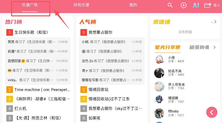 3、在热门榜和人气势区域,你能看到其他玩家最近在练习哪些热门曲目,为自己的练习选曲提供参考。