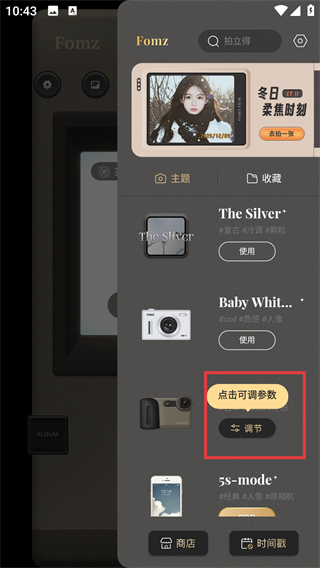3、选择主题后点击其下方的【调节】按钮,就能打开该主题的参数调整面板,自定义拍摄效果啦。
