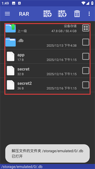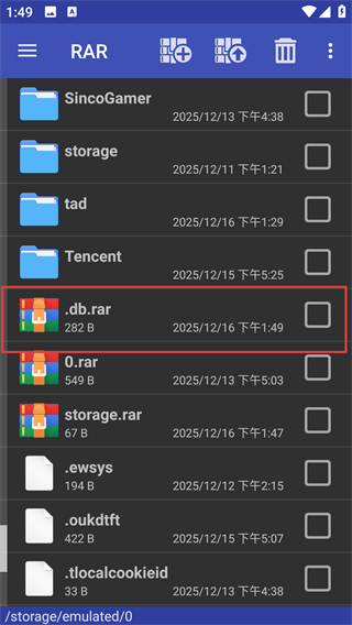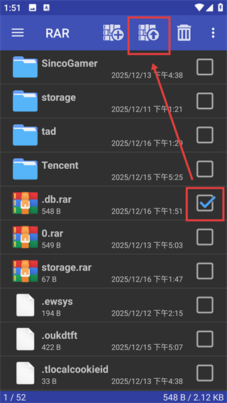 1、在RAR文件列表中找到目标压缩包(如【.db.rar】),准备进行解压操作,这是后续步骤的基础哦。