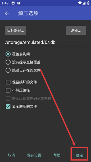 3、在解压选项界面确认目标路径和相关设置后,点击【确定】按钮,就能启动压缩包的解压流程啦。