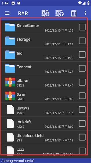 1、在RAR文件列表页能看到各类文件夹和文件,后续可选择目标内容进行压缩等操作啦。