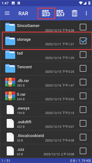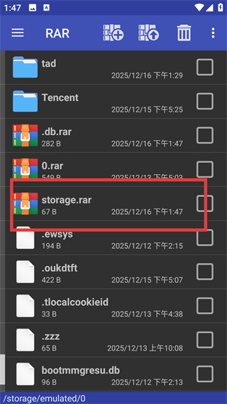 4、压缩完成后,文件列表里会出现新生成的【storage.rar】文件,代表压缩操作成功完成啦。