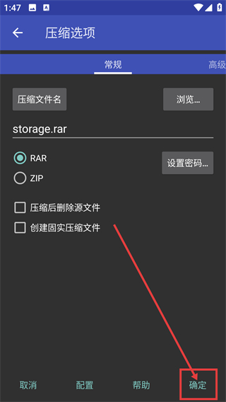 2、点顶部的压缩按钮,再勾选目标【storage】文件夹,就能进入压缩选项设置界面哦。