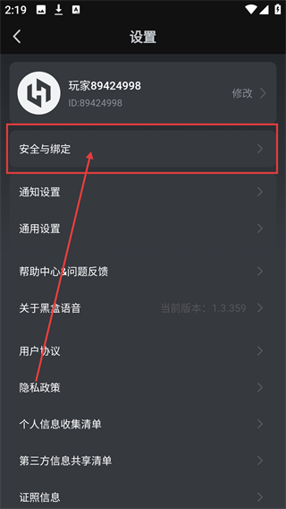 2、在设置页选择【安全与绑定】选项,就能进入账号安全相关的配置页面哦。