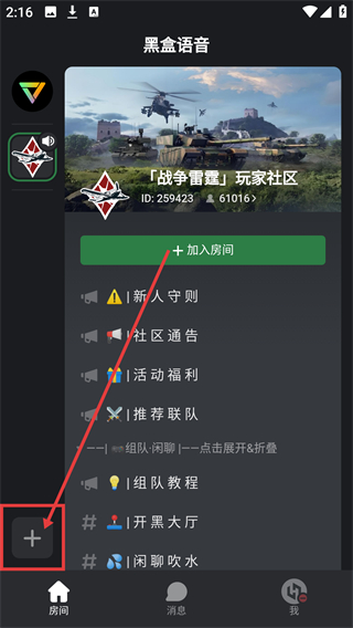 1、打开【黑盒语音】APP的房间页面,点击左下角的加号按钮,即可进入创建房间的设置界面啦。