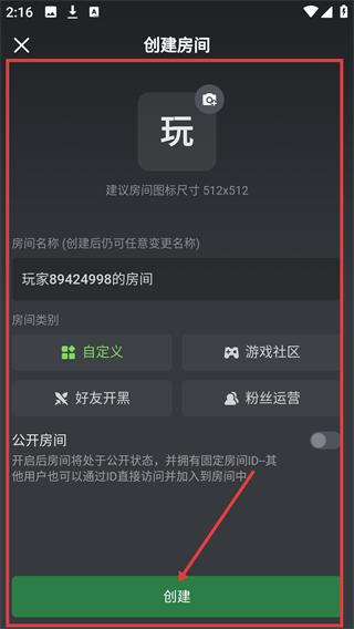 2、在创建房间界面,设置房间名称与类别,确认后点击底部的【创建】按钮,就能生成专属房间哦。