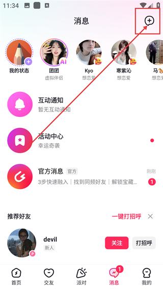 2、进入消息页面后,点击右上角的加号按钮,就能打开创建群聊的选项菜单,准备创建新群啦。