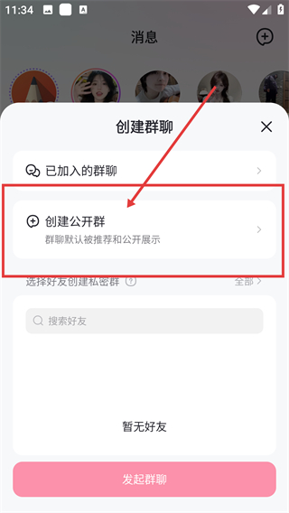 3、在创建群聊菜单中选择【创建公开群】选项,就能进入公开群的创建配置页面哦。