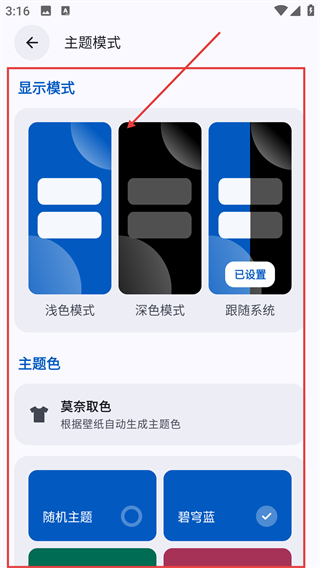 3、在主题模式页面,可选择【显示模式】(如浅色-深色-跟随系统),还能设置主题色让界面更美观呀。