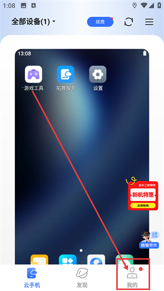1、在云手机主界面点击底部的【我的】选项,就能进入个人中心页面,找到设备相关的操作入口啦。