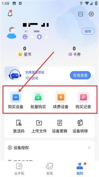2、进入个人中心后点击【购买设备】选项,就能进入云手机的购买页面,选择想要的设备配置哦。