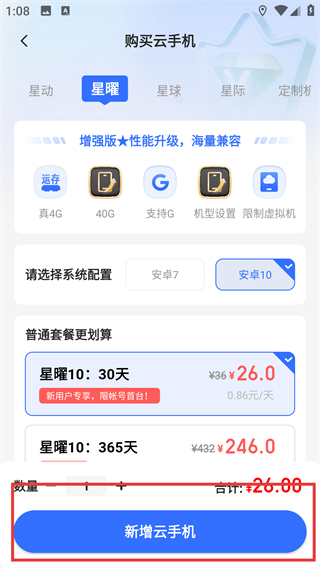 3、在购买页面选定【星曜10-30天】套餐后,点击底部的【新增云手机】按钮,就能进入支付环节啦。