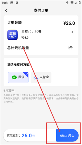 4、在支付订单页选好支付方式,点击【确认购买】按钮,就能完成云手机套餐的购买流程啦。
