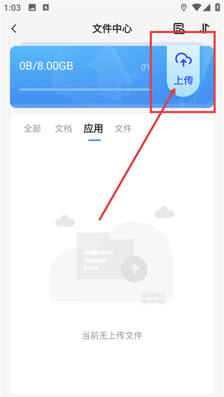 3、进入文件中心的应用分类页后,点击右上角的【上传】按钮,就能打开文件选择界面啦。