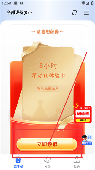 1、在云手机页点【立即领取】按钮,能获取【8小时星动10体验卡】,后续可畅玩轻量应用啦。