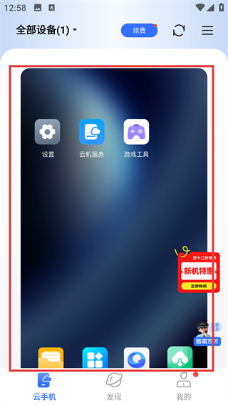 3、购买成功后返回云手机页面,轻点击进入云手机