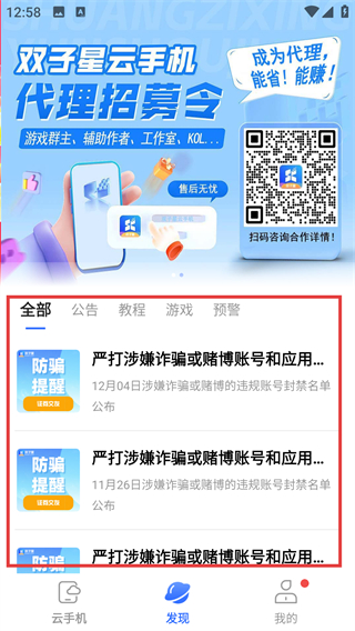 3、点底部【发现】选项进入发现页,能查看防骗提醒等公告,了解平台的违规治理信息呢。
