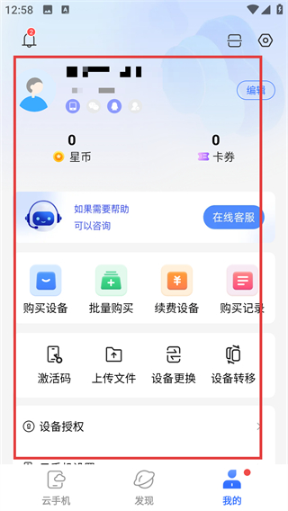 4、进入【我的】页面能看到星币、卡券等资产,还有购买设备、续费等功能,方便管理账号哦。