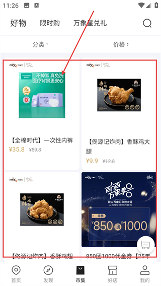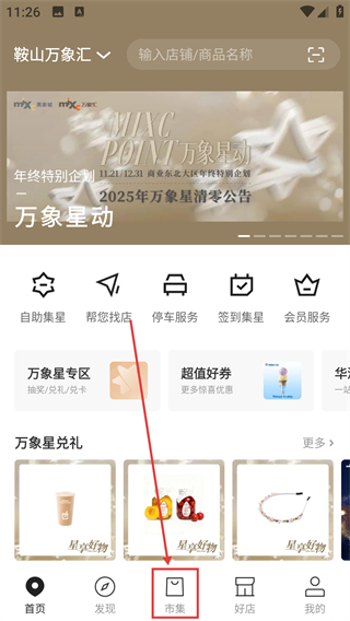 1、在鞍山万象汇首页点【市集】选项,能进入好物购买界面,后续可挑选心仪的商品啦。