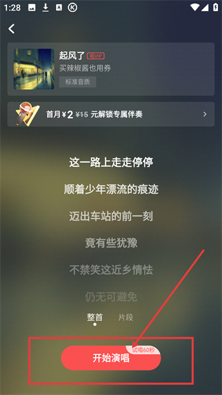 3、在演唱准备页,点【开始演唱】按钮,就能进入歌曲演唱界面,跟着歌词开启演唱啦。