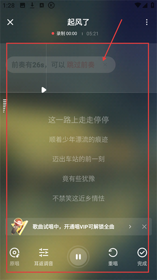 4、进入演唱界面后,可看到歌词进度,还能跳过前奏,搭配原唱、耳返调音等功能优化演唱哦。