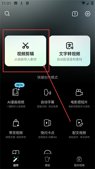 1、在APP的创作页面,点击【视频剪辑】,可从相册导入素材,进入视频编辑界面开启创作啦。