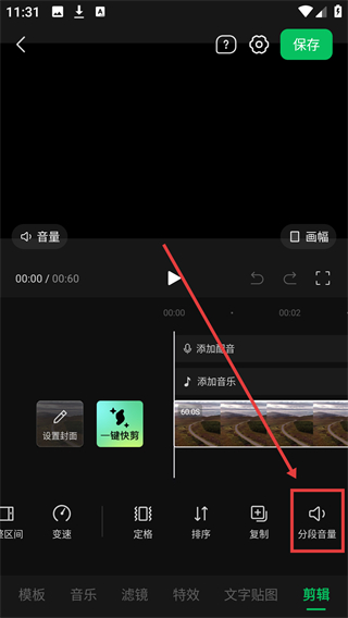 2、进入视频编辑页面后,在剪辑功能栏找到【分段音量】,点击可进入音量调整的设置界面哦。