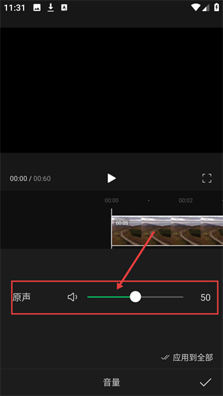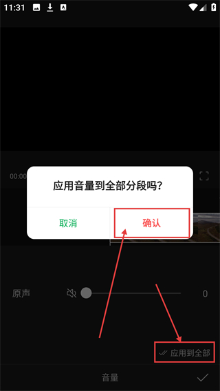 4、调整好音量后,点击【应用到全部】,再确认弹窗中的【确认】,即可将音量设置应用到所有片段啦。