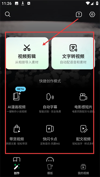 1、在创作页,可选择【视频剪辑】【文字转视频】等创作模式,按需开启视频制作流程哦。