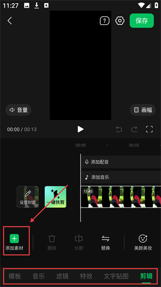 2、进入剪辑页后,点【添加素材】,能打开素材选择界面,往视频里加入新内容啦。