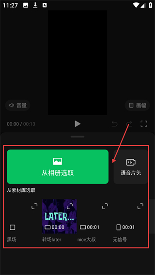 3、添加素材时,可选【从相册选取】导入本地素材,也能从素材库选预设素材来用呢。