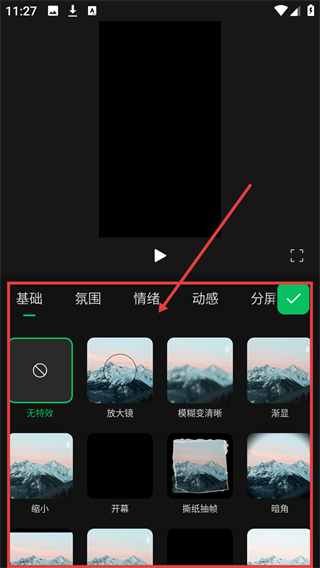 4、在特效栏,可切换【基础】【情绪】等分类,选喜欢的特效加到视频里,让效果更丰富哦。